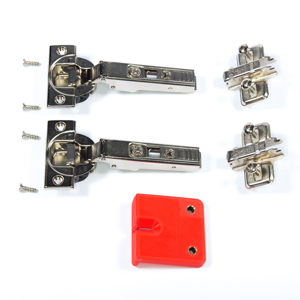 Enthalten sind zwei Blum Clipscharniere mit integrierter, abschaltbarer Dämpfung, zwei Kreuz-Montageplatten für 16 mm Korpusstärke und eine Bohrlehre. Wegen der notwendigen Präzision ist es schwierig bis unmöglich die Bohrungen ohne Hilfsmittel genau genug zu fertigen. Die Bohrungen in der Türe passen in der Regel, die 35 mm Topfbandbohrungen sind relativ einheitlich. Die Befestigung der Scharniere in der Türe ist unkritisch, hier genügen auch Spanplattenschrauben.
