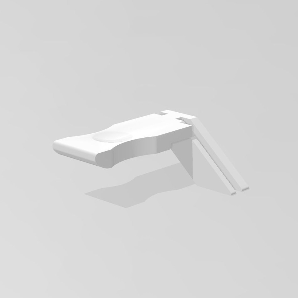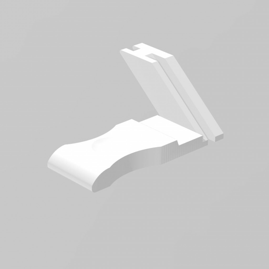 3D-gedruckte Sockelklammer für ALNO-Sockelsystem für 7 mm starken Sockel in weiß. Dieses Sockelsystem wurde ab etwa 2014 verwendet und unterscheidet sich von dem vorherigen System dadurch, dass die Klammern weiß sind und eine wesentlich längere und steilere Führung in der Nut des Sockelfußes haben.