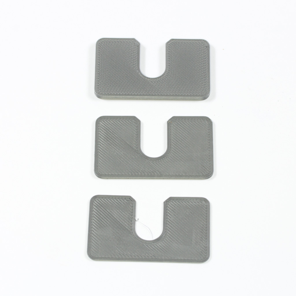 Das Set enthält je vier Unterlegplatten in 0,5 / 1 / 2 mm Stärke, 40 x 25 mm groß und ist wahlweise in silber oder schwarz erhältlich.